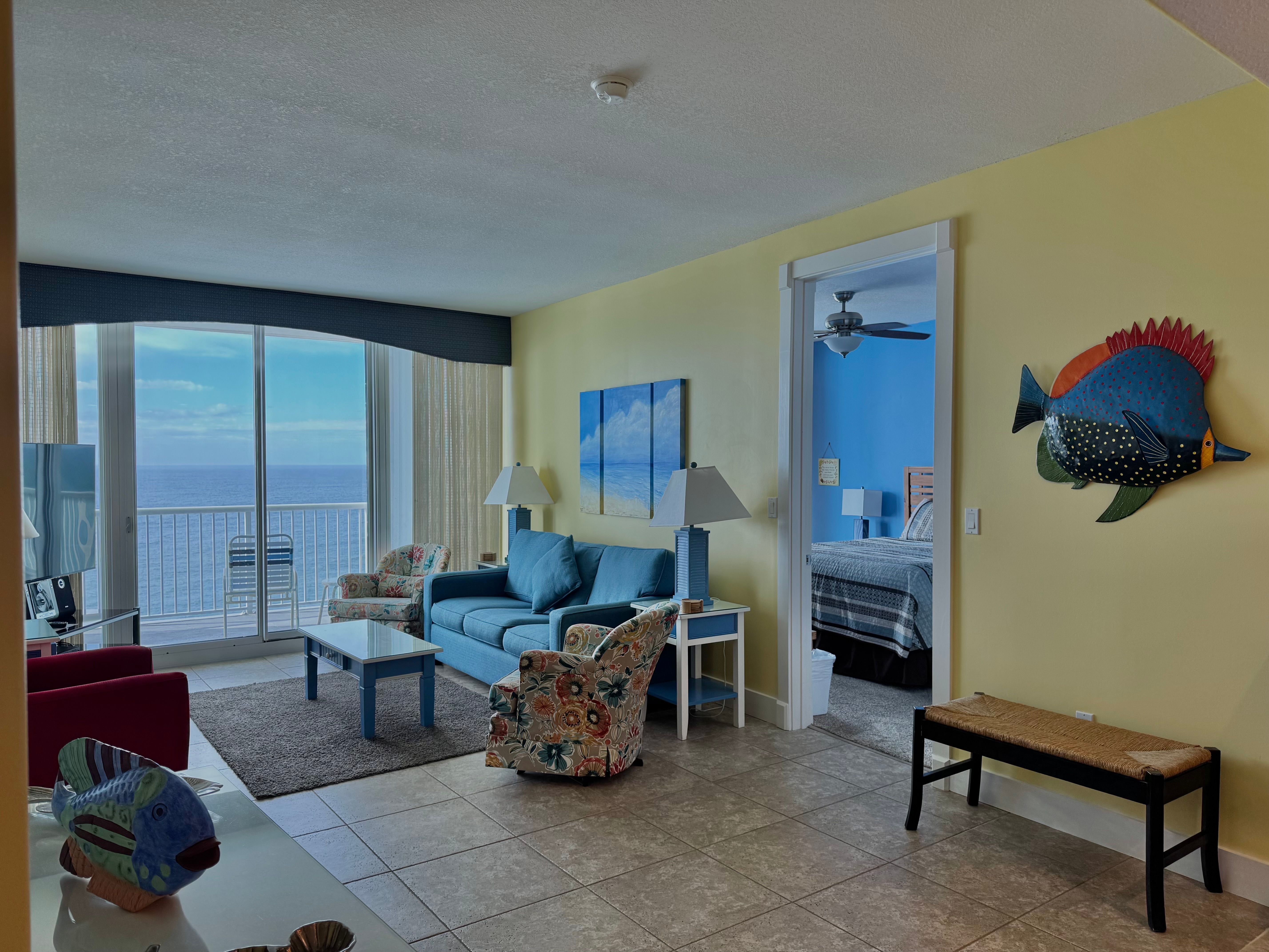 Palm Beach C22 is a spacious 1 bedroom 1.5 bath condo located on the 2nd floor with a side view of the gulf from the living area. Both living room and bedroom has balcony access. The condo is approximately 863 sq ft with an over-sized en suite bath